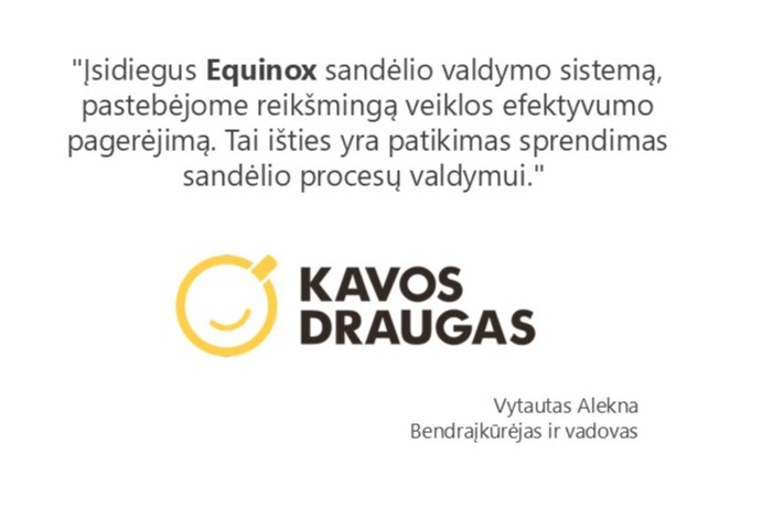 Vytautas Alekna, "Kavos Draugas" vadovas, dalinasi savo pastebėjimas apie Equinox SVS: "Įsidiegus Equinox sandėlio valdymo sistemą, pastebėjome reikšmingą veiklos efektyvumo pagerėjimą."